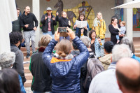 Der Surprise Strassenchor, der Chor der Musikschule Riehen und Sarah Hänggi verwandelten den Dorfplatz Riehen in einer farbenfrohe und stimmgewaltige offene Bühne.