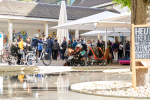 Der Surprise Strassenchor, der Chor der Musikschule Riehen und Sarah Hänggi verwandelten den Dorfplatz Riehen in einer farbenfrohe und stimmgewaltige offene Bühne.